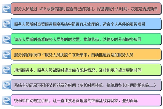 “服务e”是传统服务行业的呼叫中心在互联网+应用中的升级版,其融合了传统呼叫中系统、手机APP应用、网上微信WECHAT...,企业内部服务管理进行整合,实现统一管理,提高企业效率、节省运营成本。 “服务e”包含一下六大模块: 调度人员在分派任务时,可以通过技能水平、服务类型、地理位置等等系统预先设置好的调度方案,自动调度合理的服务人员。 二线服务人员通过手机APP接单,提交任务进展(接受、拒绝、中断、取消、完成)。。
